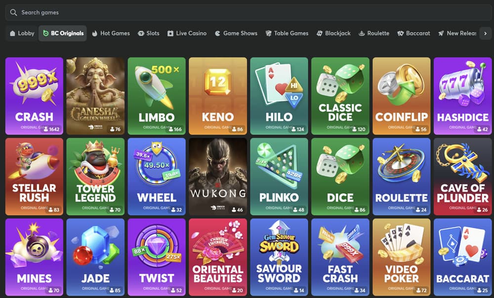 - Casino: ~10,000+ slots, table games, live dealer, game shows, and BC.Game's own provably fair originals (Crash, Mines, Plinko, Hash Dice, Limbo).